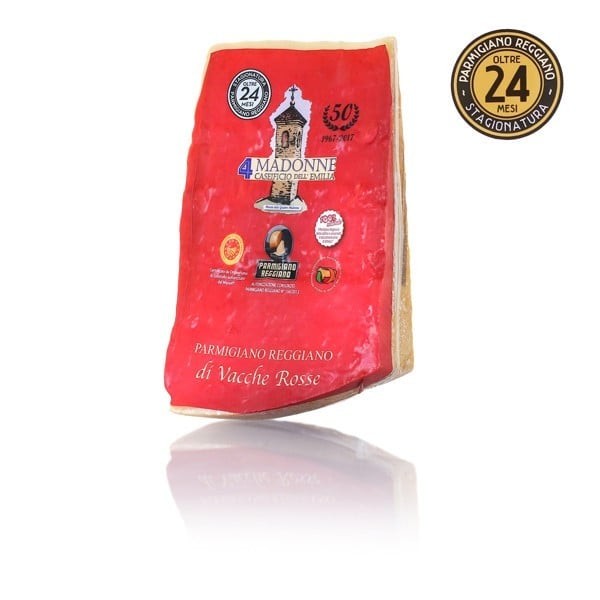 Il latte prodotto dalle vacche rosse è particolarmente ricco di grassi e di caseina, una proteina importantissima al fine del processo di trasformazione del latte in formaggio e particolarmente adatta ad una lunga stagionatura. Da questo latte speciale si ottiene il Parmigiano Reggiano Vacche Rosse. Il Parmigiano Reggiano Vacche Rosse 24 mesi è una qualità molto pregiata di Parmigiano Reggiano. Ha un valore nutritivo molto elevato che è dovuto al maggior contenuto di acidi grassi nel latte e di conseguenza anche nel formaggio.