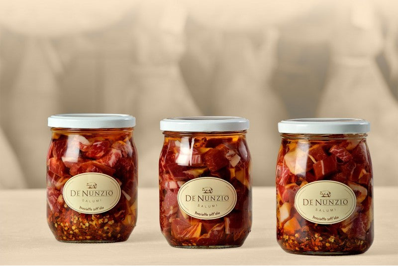 In barattoli sterili di vetro, con una spolverata di peperoncino, i tocchetti di prosciutto vengono ricoperti di olio di semi, ottimo conservante naturale che non adultera le caratteristiche organolettiche del prodotto.